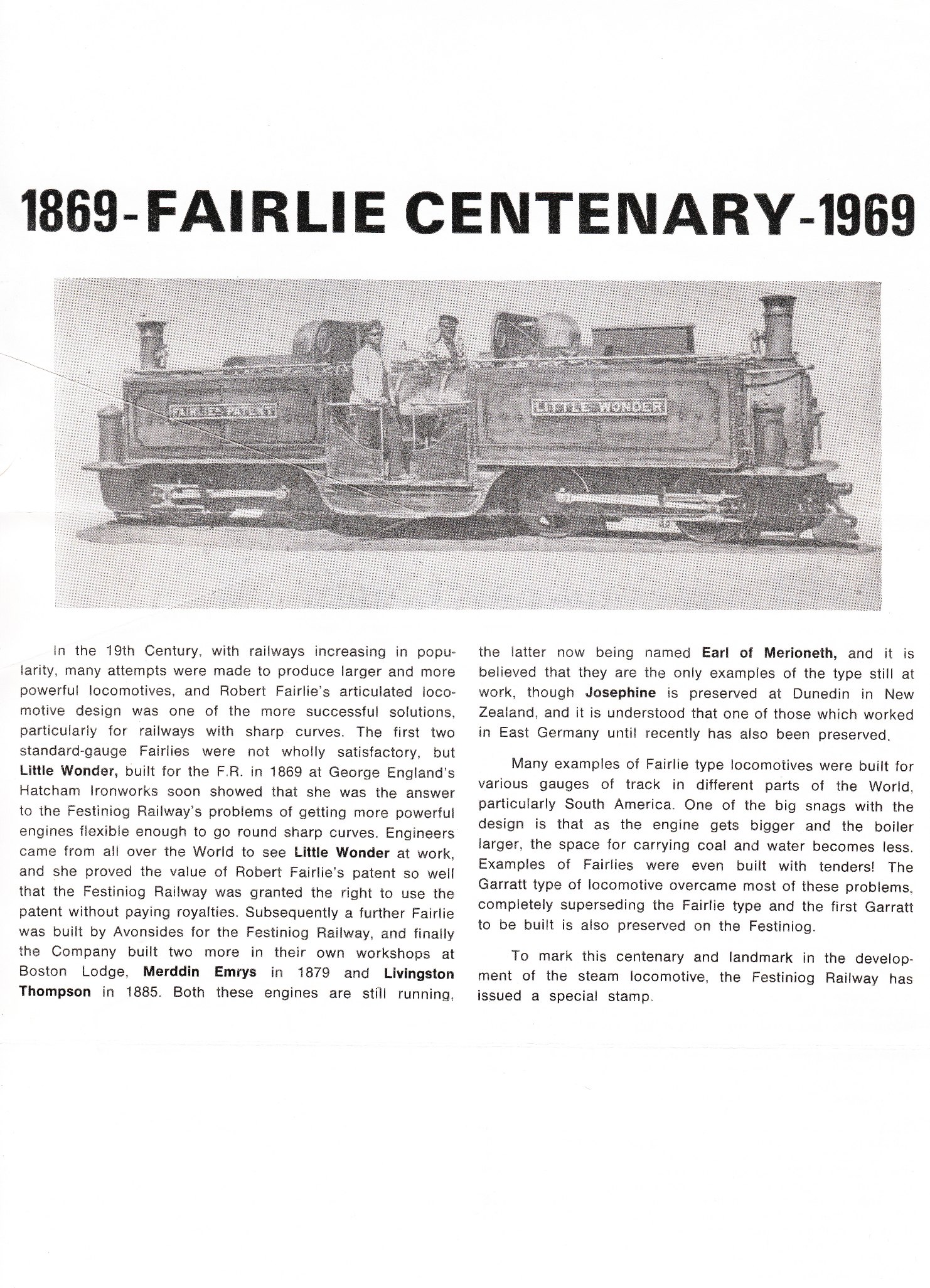 Die Lokomotive "Little Wonder" = Kleines Wunder wurde 1869 von Robert Francis Fairlie patentiert.