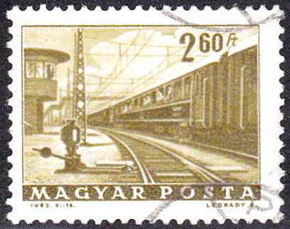 Auf dieser Marke aus Ungarn (MiNr 1937 A) sind rechts Personenwagen eines Zuges zu sehen.