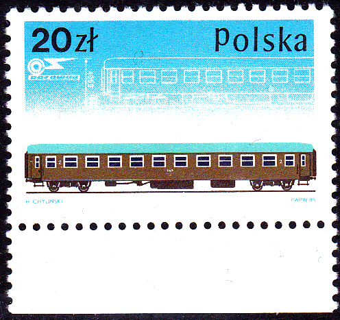 Aus Polen kommt diese Marke (MiNr 2996) mit einem Schnellzugwagen.