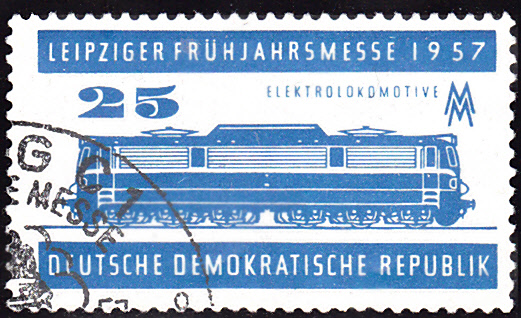Auf dieser Marke zur Leipziger Messe 1957 (MiNr 560) ist eine Elektrolokomotive abgebildet.
