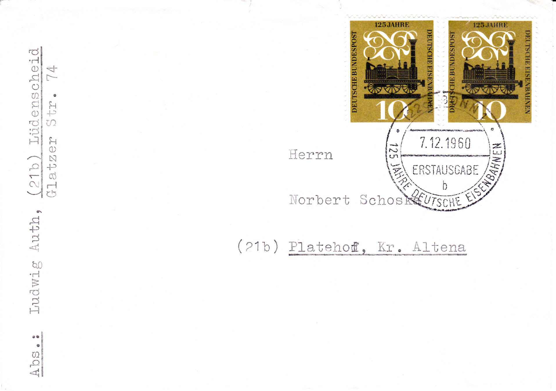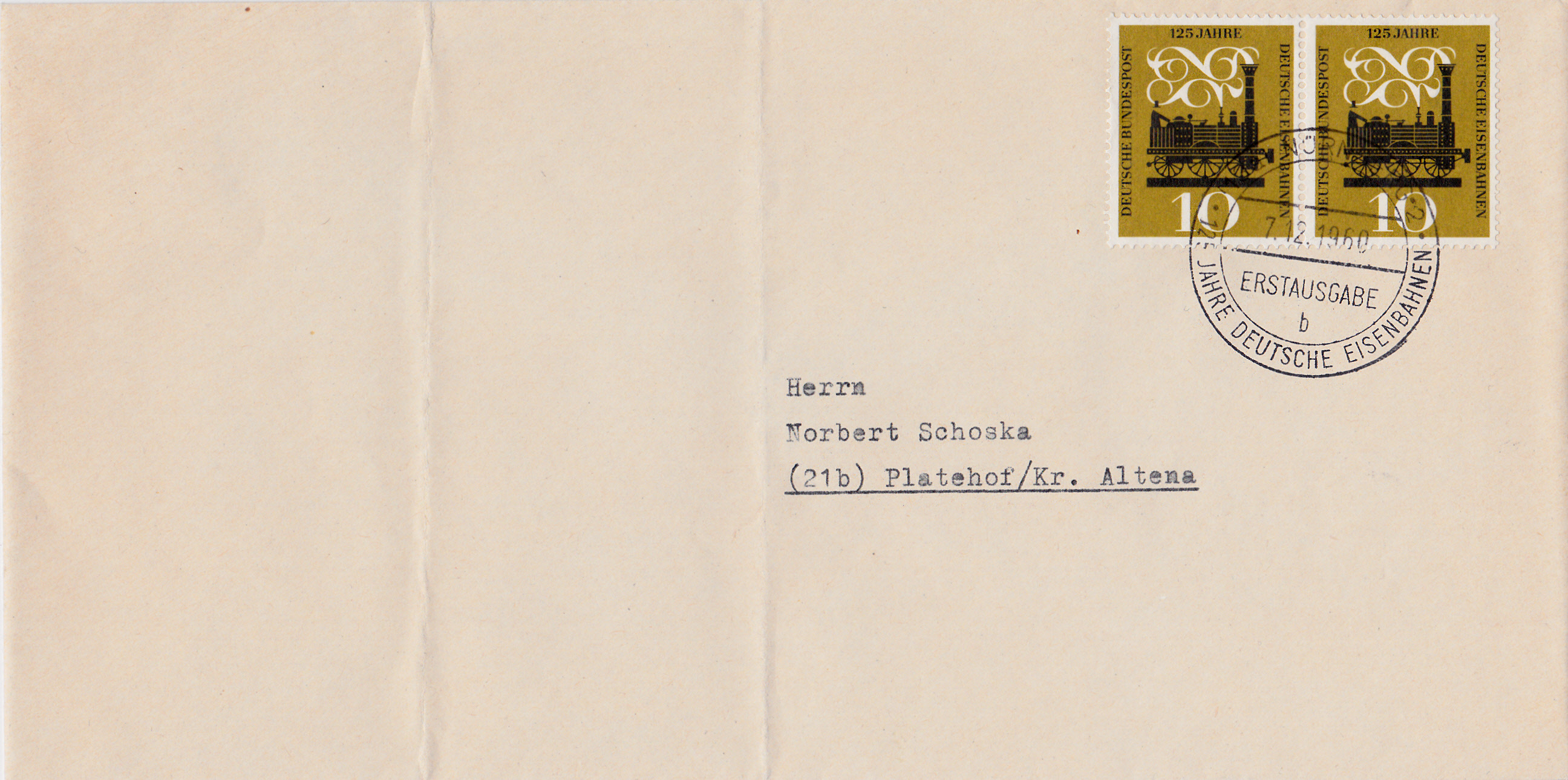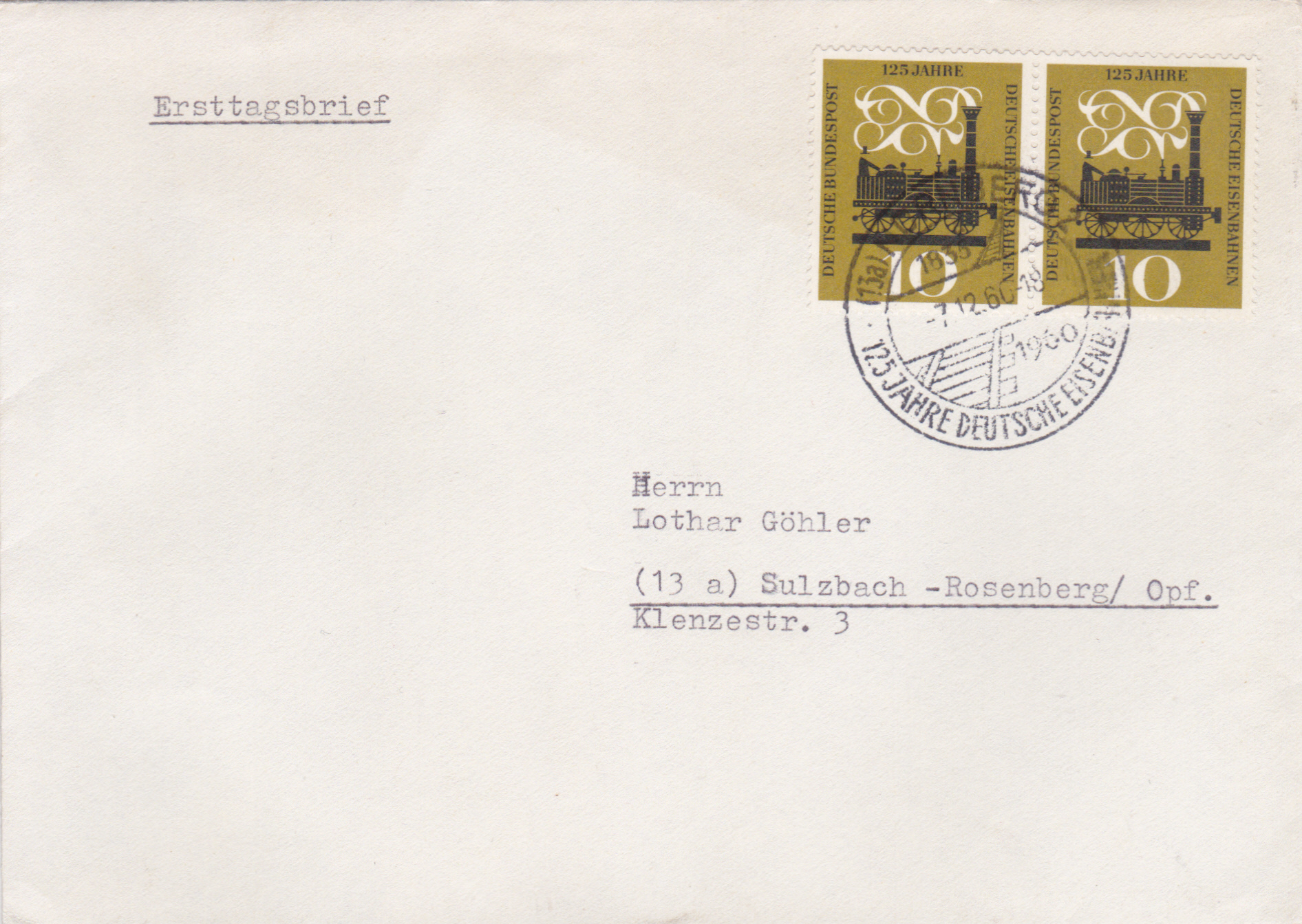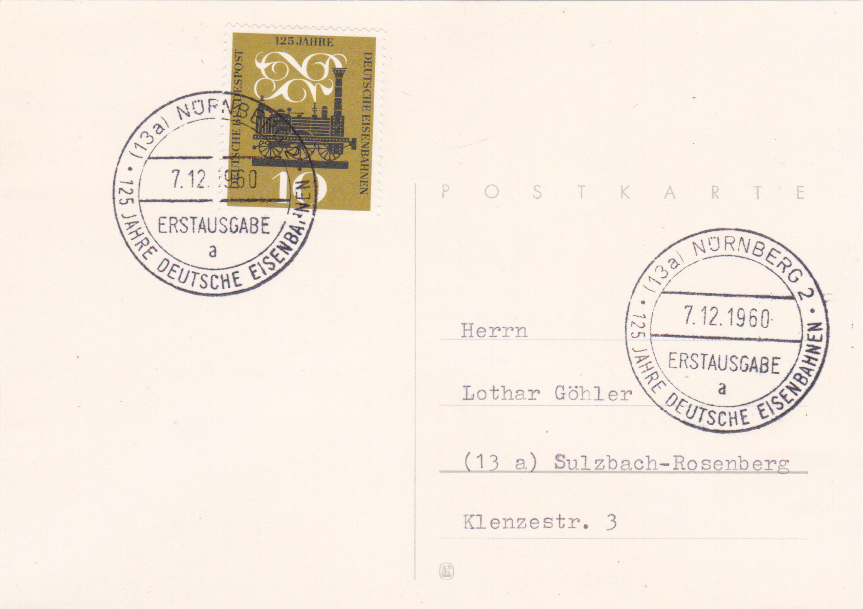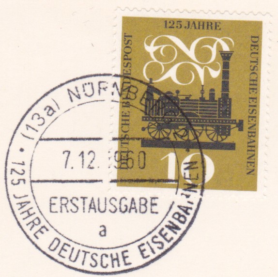 In Nürnberg gab es ebenfalls einen Ersttagsonderstempel zu der Marke der Deutschen Bundespost (MiNr 345) zum Jubiläum "125 Jahre Deutsche Eisenbahn". Hier zeige ich eine Stempel mit dem Kennbuchstaben b".