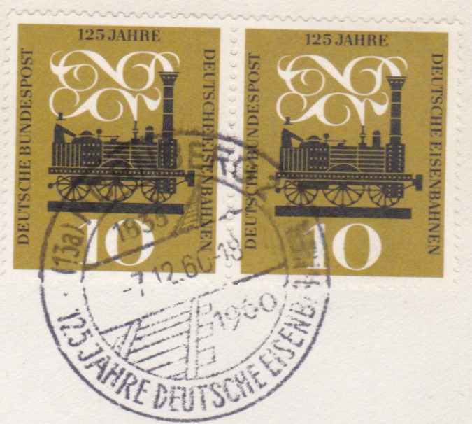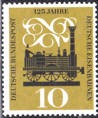 Auch bei der Deutschen Bundespost gab es eine Marke (MiNr 345) zum Jubiläum "125 Jahre Deutsche Eisenbahn". Die Marke zeigt die erste Dampflokomotive in Deutschland "Adler".