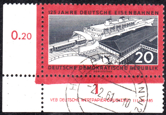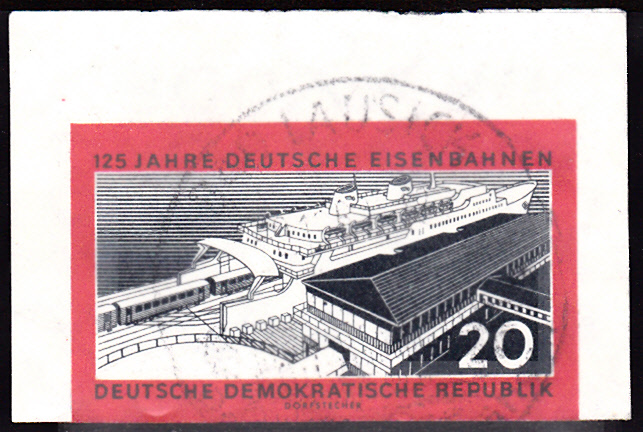 Auf der Marke zu 20Pf (MiNr 805) werden der Neuer Bahnhof Sassnitz-Hafen und die Eisenbahnfähre "Sassnitz" gezeigt. Die Marke gibt es gez (MiNr 805 A) und geschnitten (MiNr 805 B):