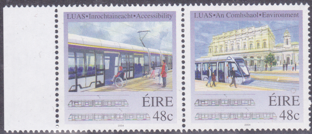 Zur Inbetriebnahme des LUAS-Straßenbahnsystems in Dublin ist diese Marke (MiNr 1591) mit einem Niederflur-Straßenbahntriebzug an einer Haltestelle erschienen.