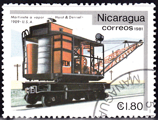 Auf dieser Marke aus Nicaragua (MiNr 2234) wird ein Dampfkran aus dem Jahre 1909 gebaut von der Firma Hoist & Derriel gezeigt.