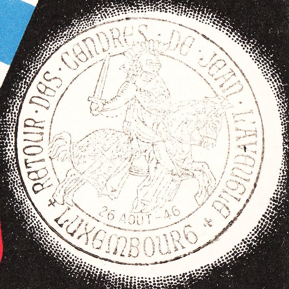 Dieser Beleg vom 26.08.1946 dokumentiert seinen 600. Todestag mit einem Sonderstempel, der ihn als Ritter zu Pferd zeigt:
