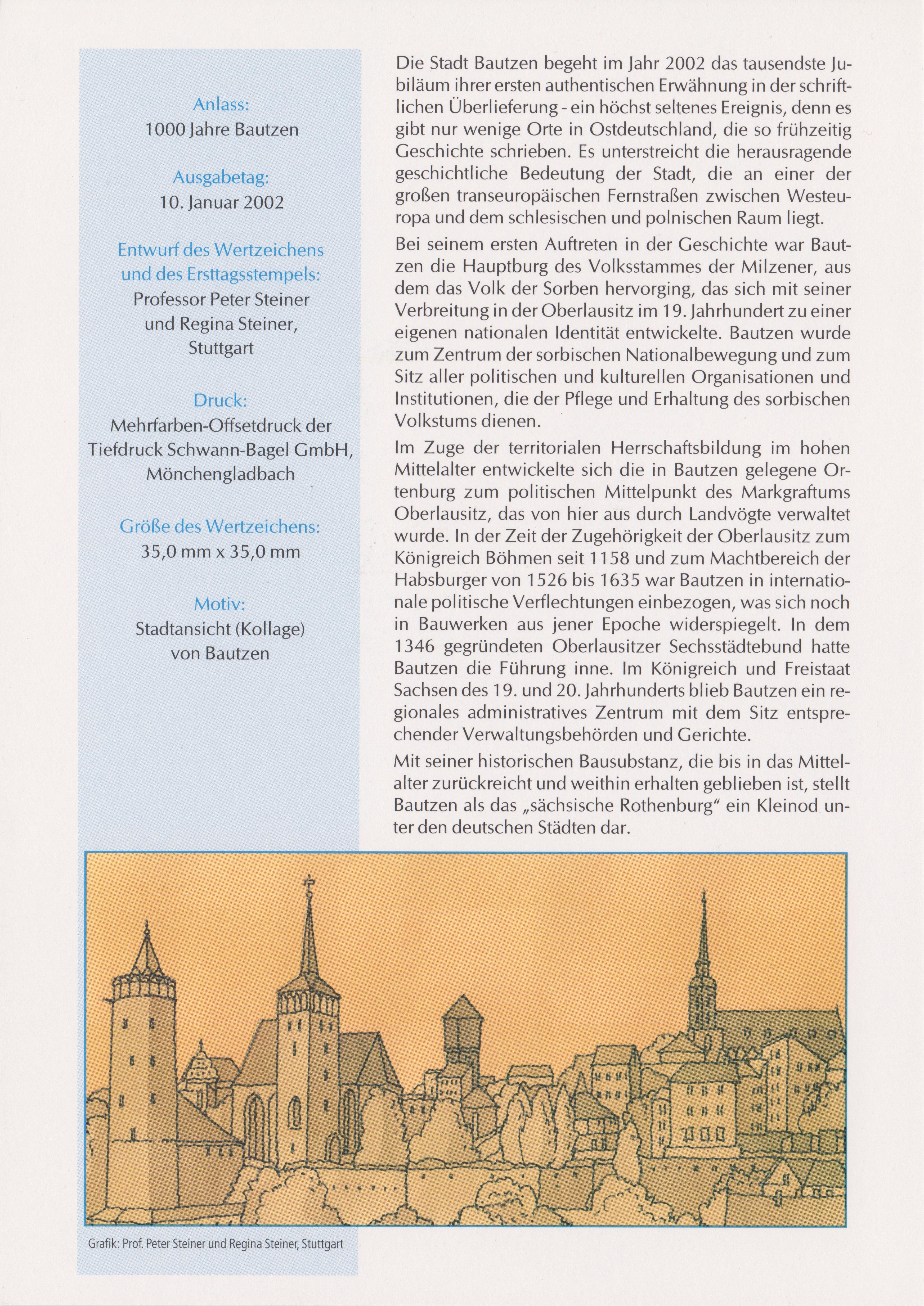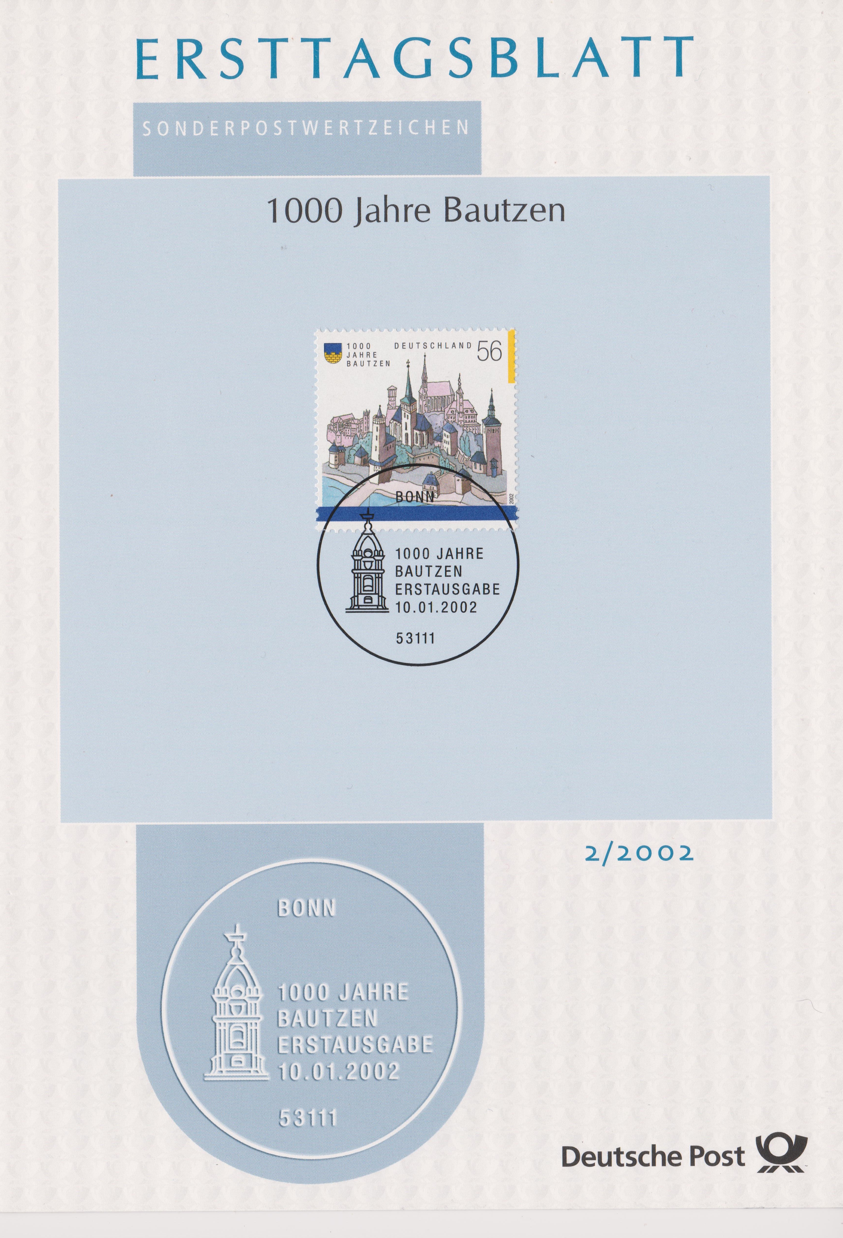 Bund MiNr. 2245 erschien am 10.01.2002 aus Anlass "1000 Jahre Bautzen" und zeigt die mittelalterlche Ansicht der Stadt Bautzen, hier auf ETB 2/2002: