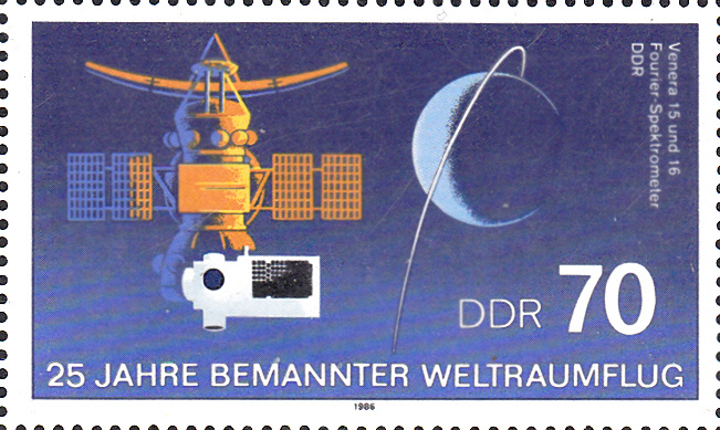 In einer Serie "25 Jahre bemannter Weltraumflug" ist in der DDR diese Marke mit einer Venussonde "Venera", einem Fourier-Spektrometer und einer Umlaufbahn um die Venus erschienen.