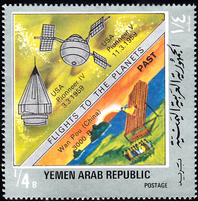 Auf dieser Marke aus Jemen-Nord (MiNr 921) wird auch Pioneer 4 gezeigt.