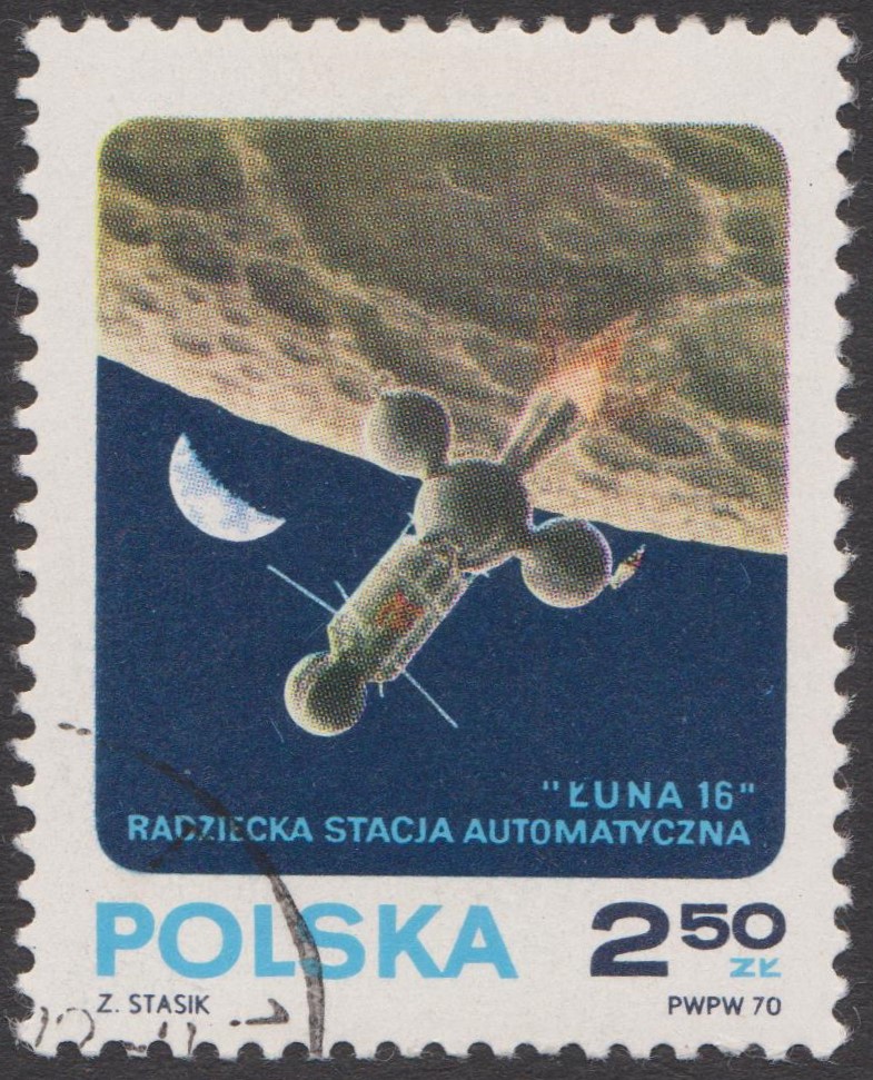 Die unbemannte Mondsonde LUNA 16 beim Start vom Mare Fecunditatis zeigt dieses Postwertzeichen Polen MiNr. 2040: