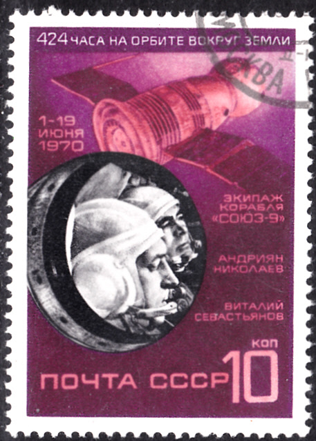 Postfrisches Exemplar der zum Weltraumflug von Sojus 9 in der Sowjetunion erschienenen MiNr. 3779 mit der Abbildung der Kosmonauten Andrijan Nikolajew (1929-2004) und Witalij Sewastjanow (1935-2010) und dem Raumschiff Sojus 9: