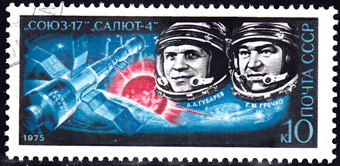Diese Marke der Sowjetunion (MiNr 4343) zeigt die beiden Kosmonauten von Sojus 17 Aleksej Gubarew (1931-2015) und Georgij Gretschko (1931-2017) und die Raumstation Saljut 4.