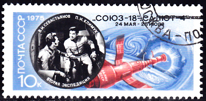 Auf dieser Marke der Sowjetunion (MiNr 4402) sind die beiden Kosmonauten Pjotr Klimuk (geb. 1942) und Witalij Sewastjanow (1935-2010) sowie das Raumschiff Sojus 18 und die Raumstation Saljut 4 abgebildet.