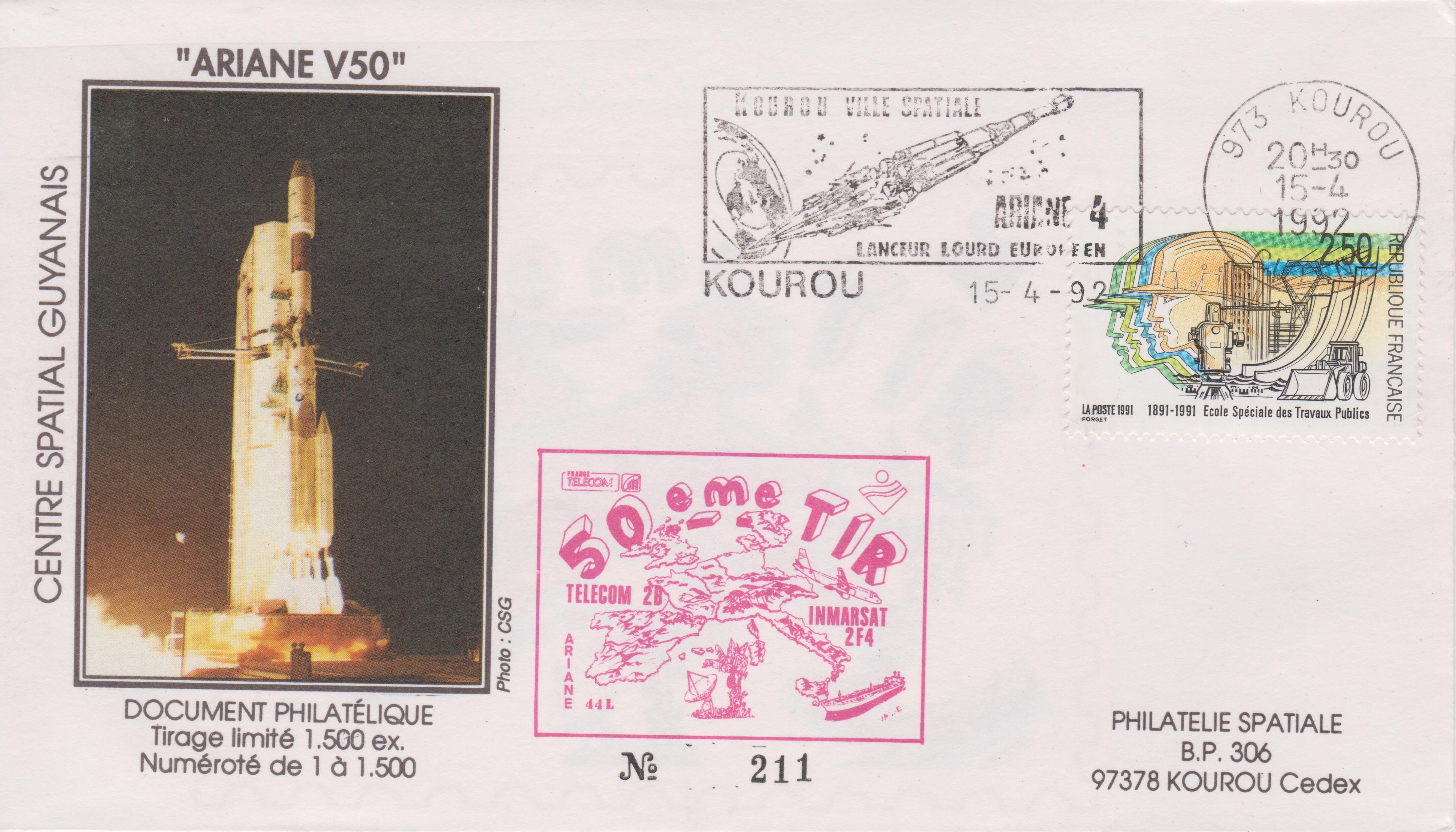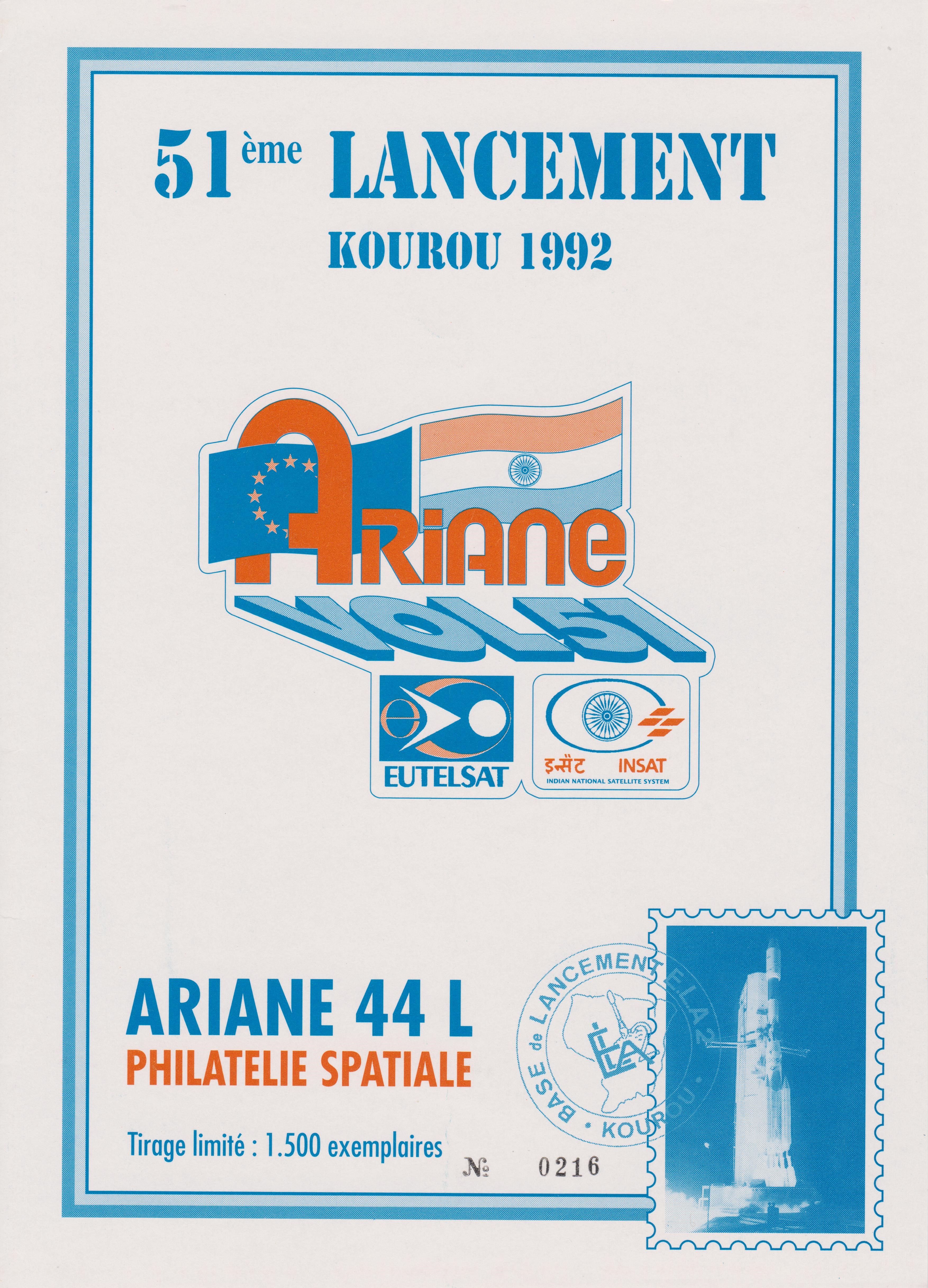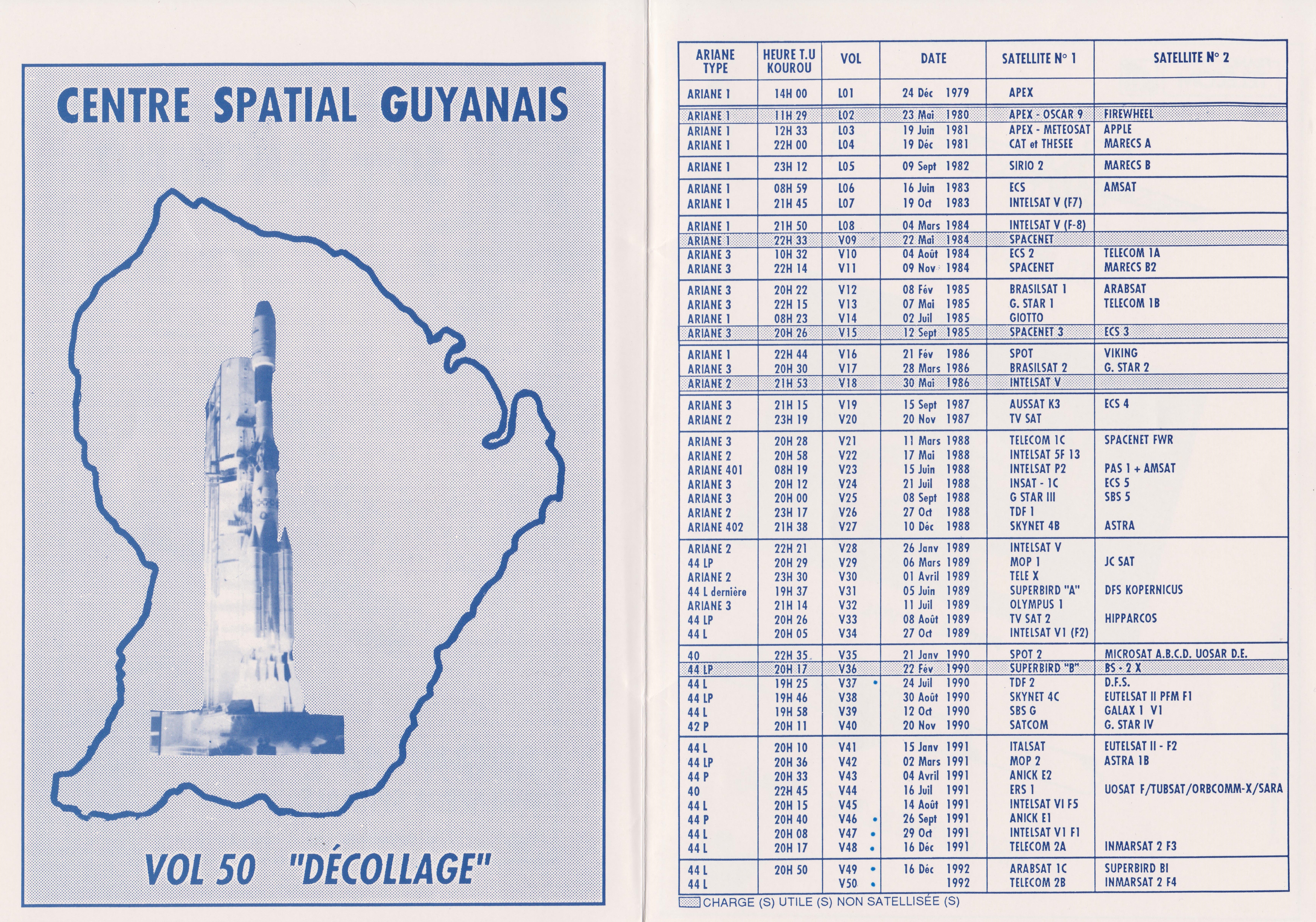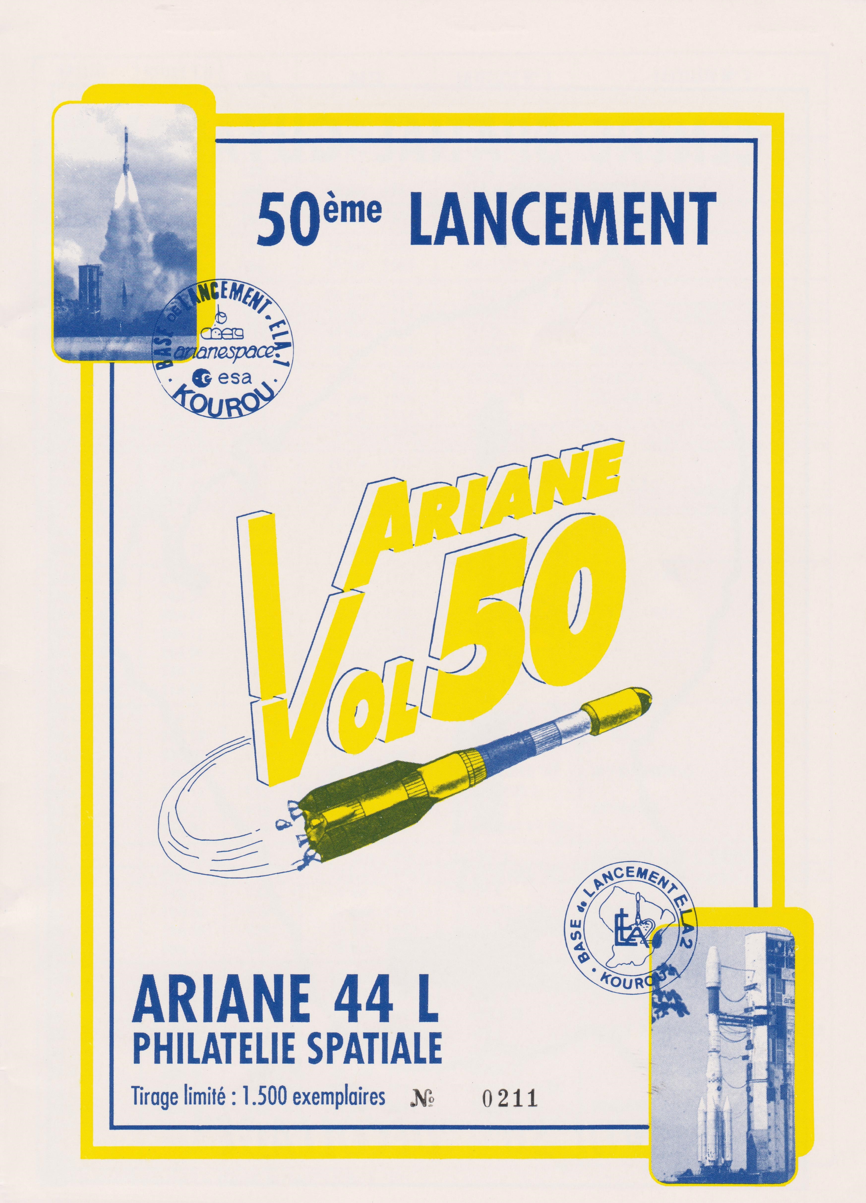 Zum 50. Start einer ARIANE wurde in einer nummerierten Auflage von 1500 Exemplaren dieses Faltblatt aufgelegt, dem man die Informationen zu den ersten 50 ARIANE-Starts entnehmen kann: