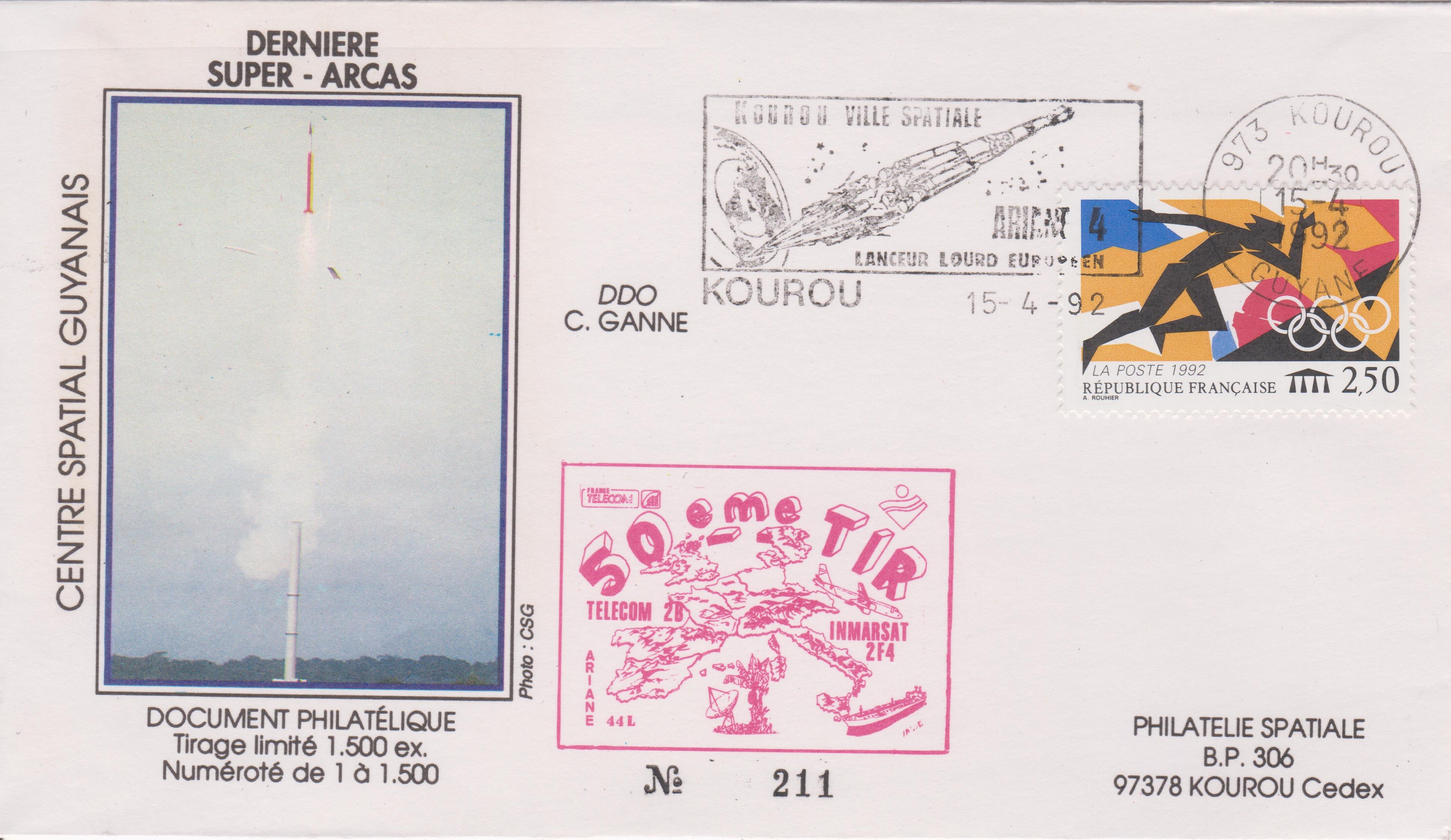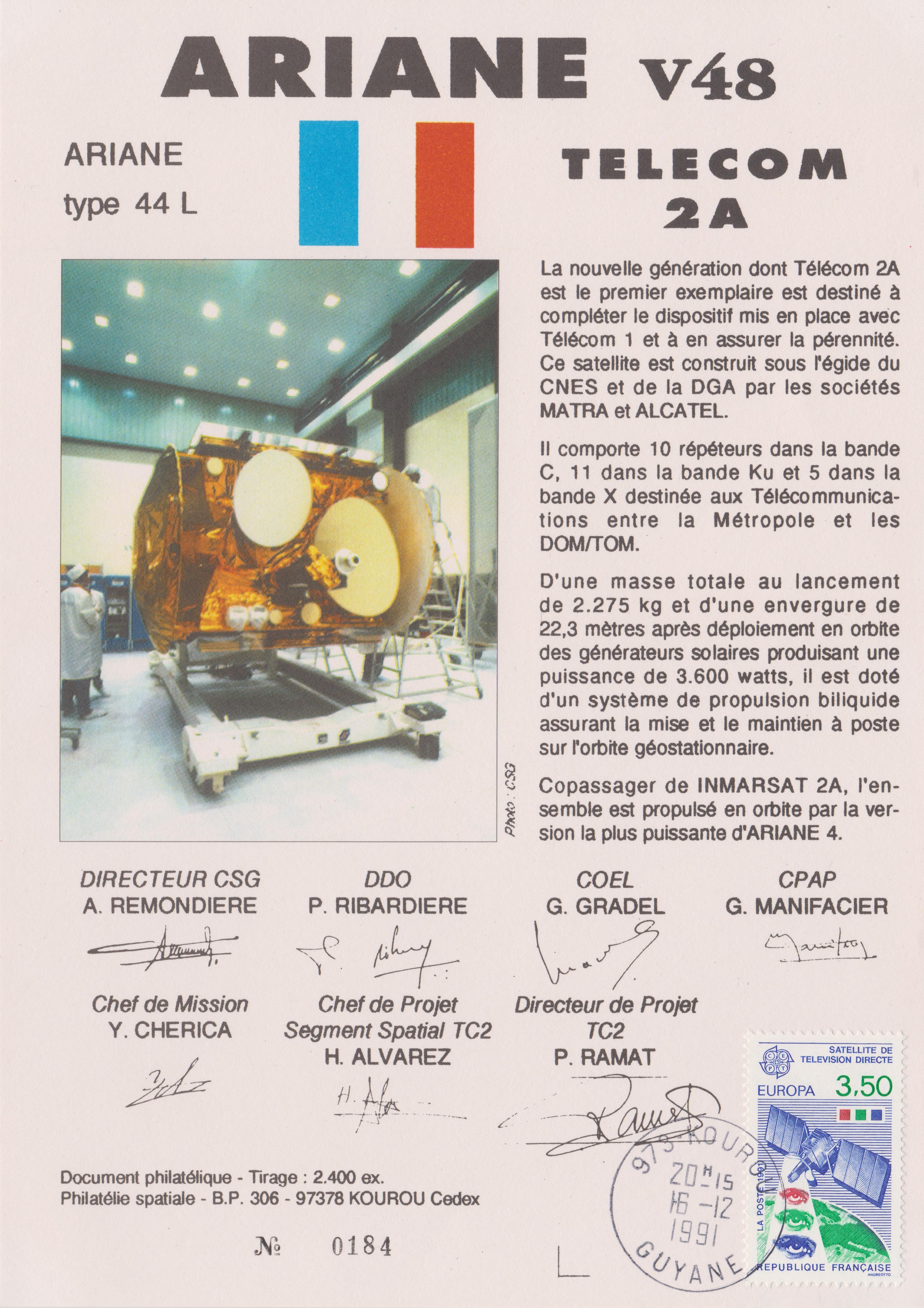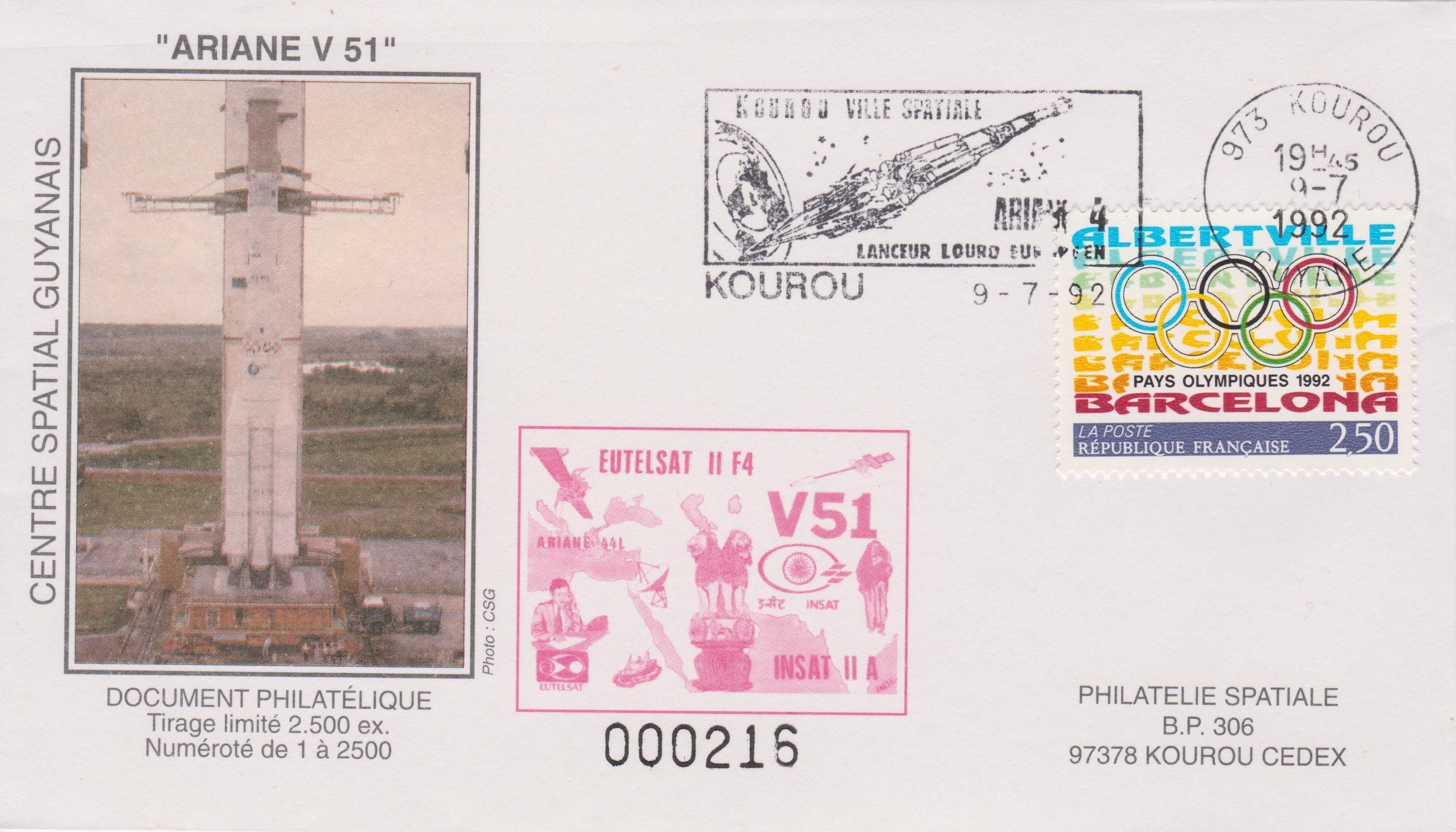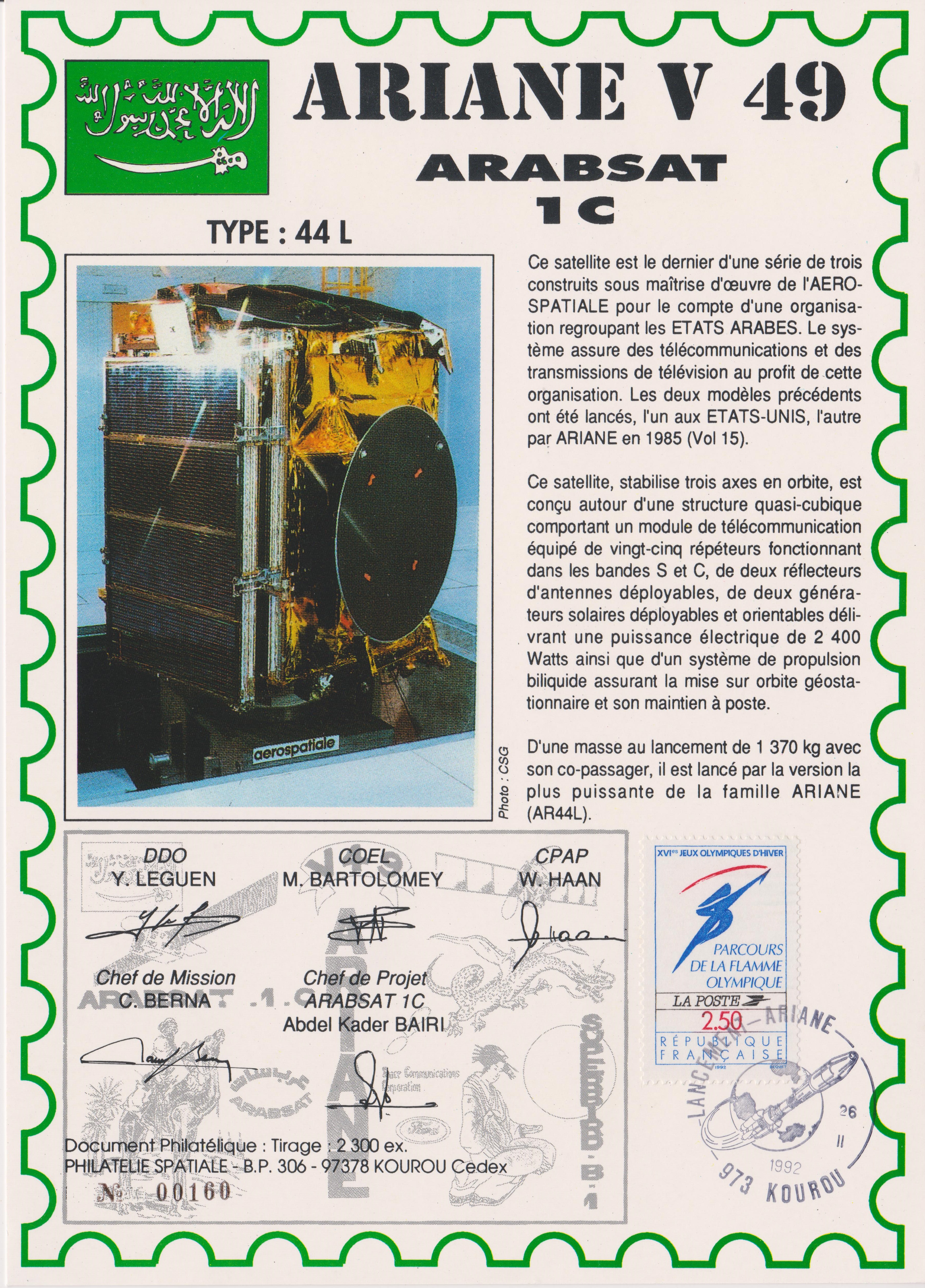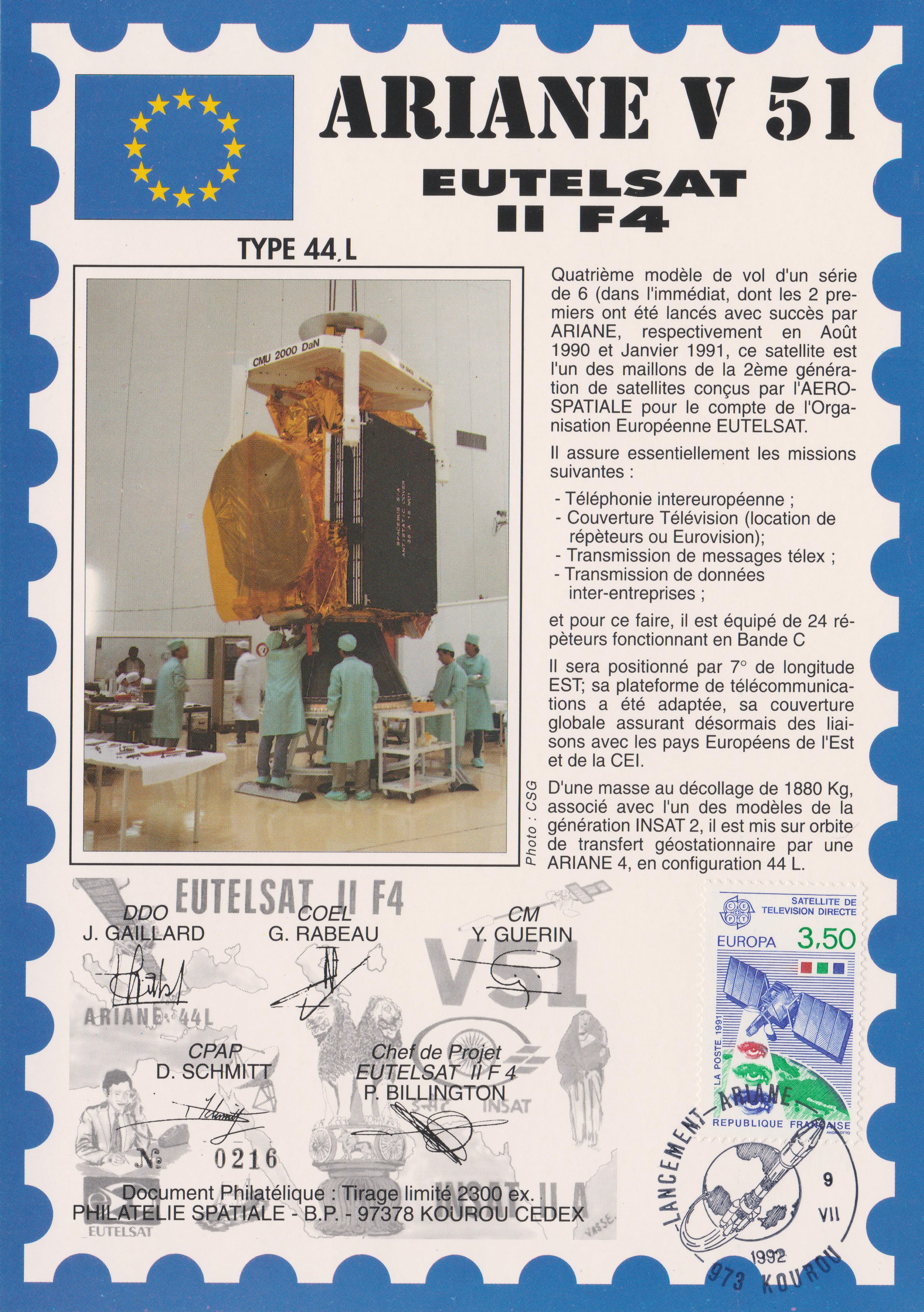Zum 50. Start einer ARIANE wurde in einer nummerierten Auflage von 1500 Exemplaren dieses Faltblatt aufgelegt, dem man die Informationen zu den ersten 50 ARIANE-Starts entnehmen kann: