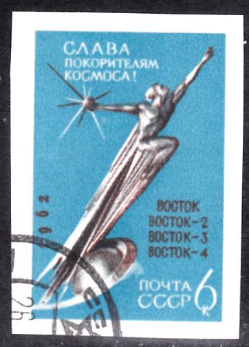 Die beiden bildgleichen Marken "Eroberer des Weltalls" der Sowjetunion zeigen die Skulptur "Ins Weltall" von Grigorij Postnikow (1914-1978, Bildhauer) und Namen der Raumschiffe Wostok 2, Wostok 3 und Wostok 4.