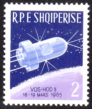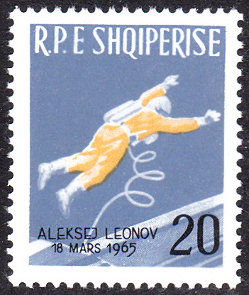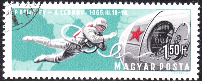 In einer Serie "Bemannte Weltraumfahrt" aus Ungarn ist diese Marke (MiNr 2303 A) erschienen. Sie zeigt den Raumflug mit "Woschod 2" (P. Beljajew, A. Leonow; 18.-19.3.1965) und den 1. Raumausstieg über dem Mittelmeer.
