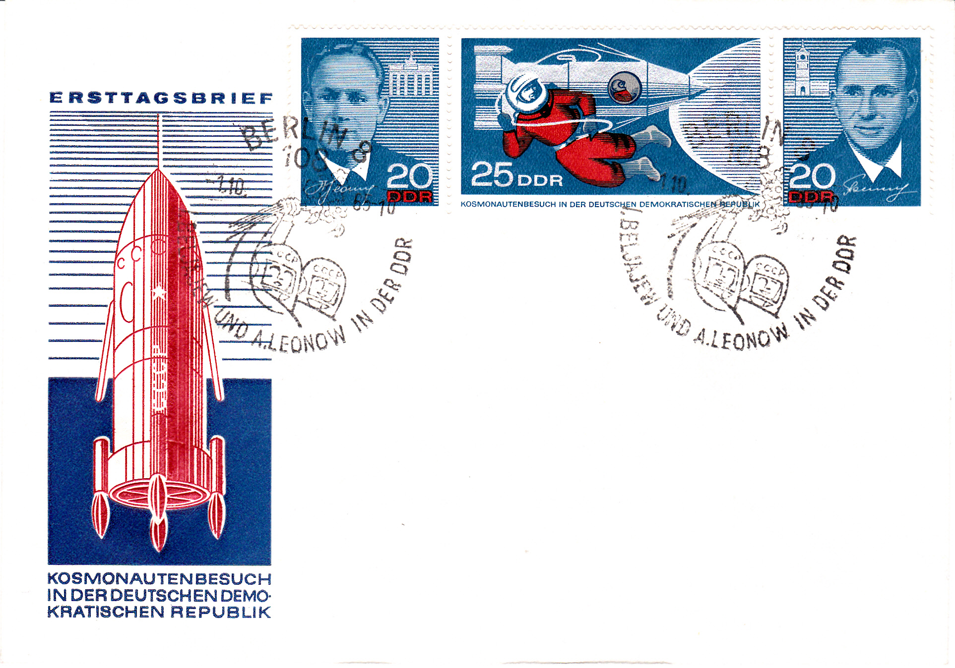 Der bereits hier gezeigte Zusammendruck (MiNr W ZD 159) zum Besuch der sowjetischen Kosmonauten Beljajew und Leonow in der DDR wurde hier auf einem nicht gelaufenen Brief mit dem Ersttagsonderstempel Berlin 8.