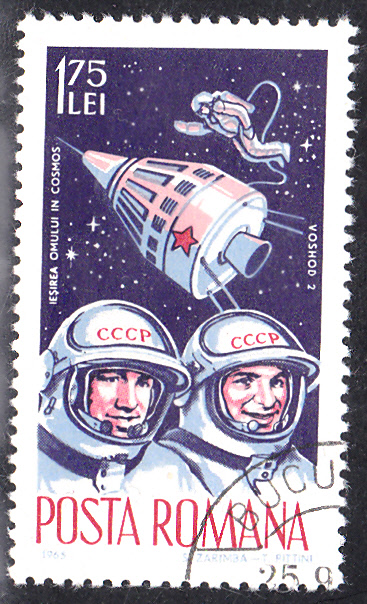 Auf dieser Marke aus einer Serie "Weltraumfahrt" aus Rumänien (MiNr 2427) sind Woschod 2, die beiden Kosmonauten und zusätzlich Leonow bei seinem "Ausflug" in den Weltraum zu sehen.