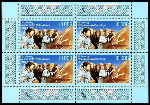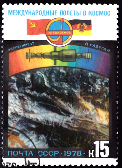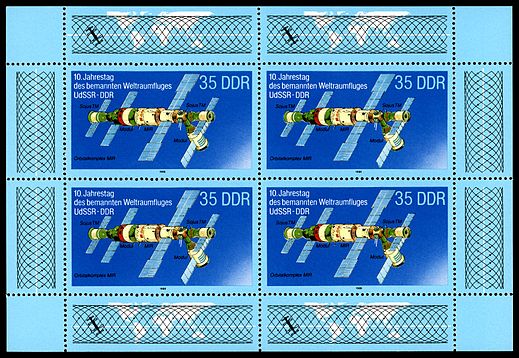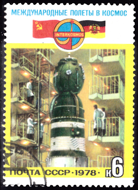 Zum gemeinsamen Weltraumflug UdSSR-DDR sind auch der Sowjetunion Marken erschienen. Hier zeige ich die Marke zu 6 Kopeken (MiNr 4763) mit der Abbildung der Montagehalle und dem Raumschiff Sojus 31.