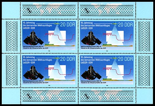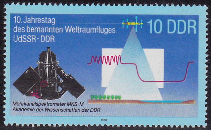 Auf der zweiten Marke (MiNr 2171) dieser Serie zum 10. Jahrestag des gemeinsamen Weltraumfluges UdSSR-DDR werden ein Mehrkanalspektrometer MKS-M und eine Messkurve gezeigt.
