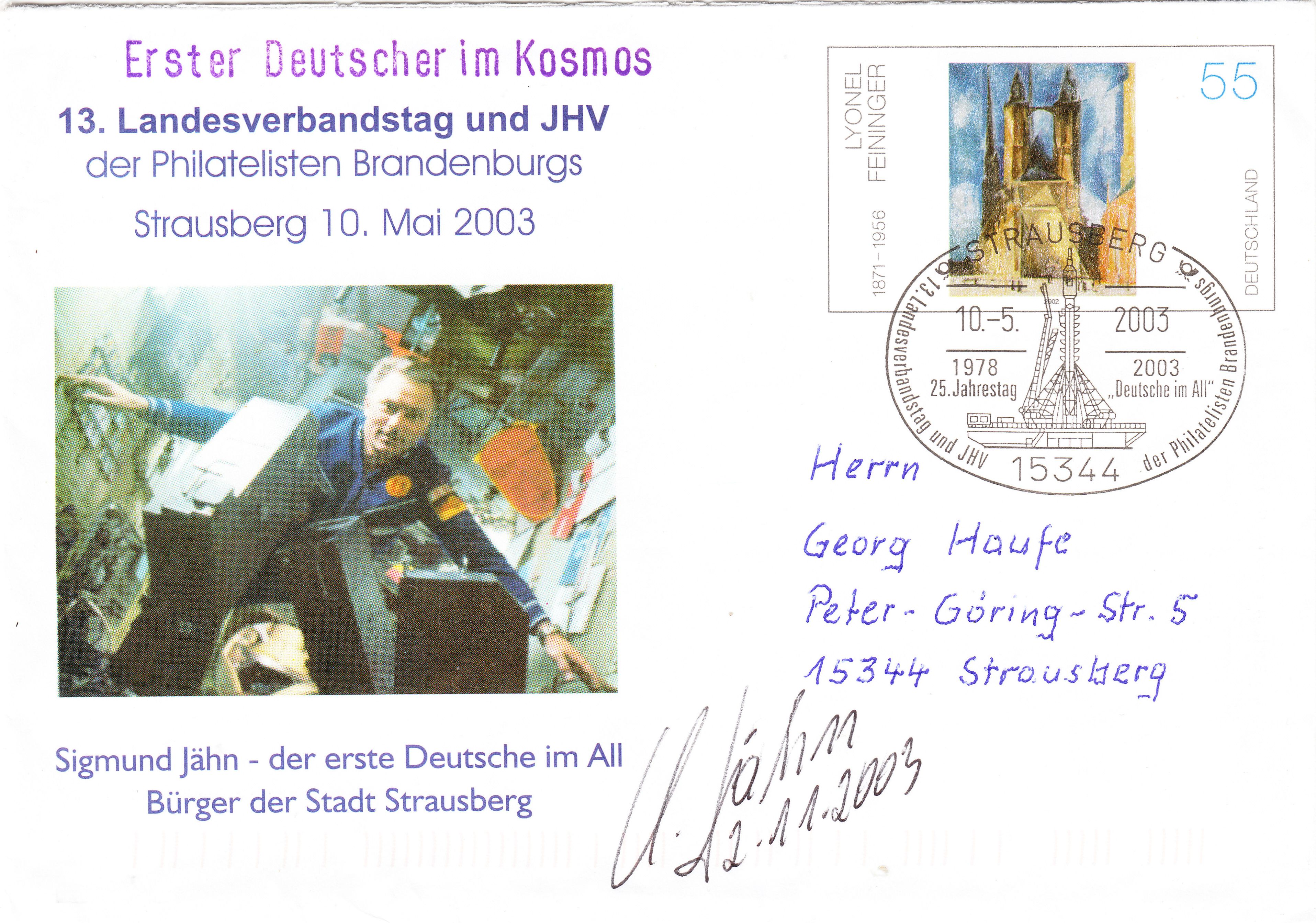 Es handelt sich um eine Ganzsache, die zum Landesverbandstag 2003 aufgelegt und mit dem entsprechenden Sonderstempel entwertet wurde. Am 02.11.2003 gelang es einem eifrigen Autogrammjäger dann, ein Originalautogramm von Sigmund Jähn auf diesem Beleg zu ergattern.