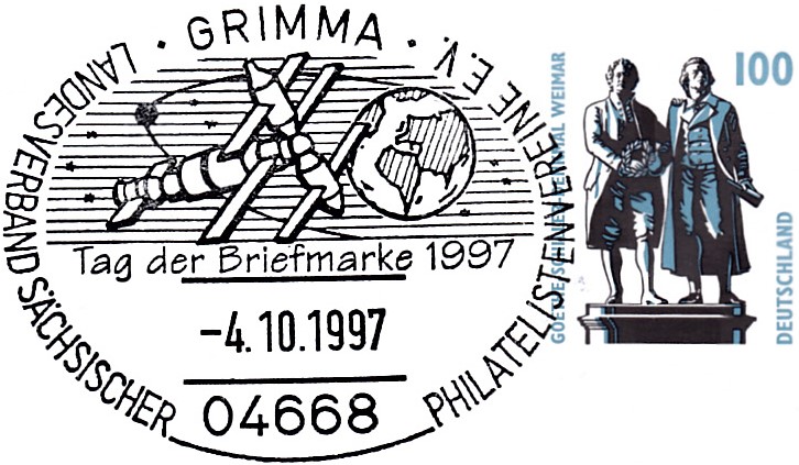 Der Landesverband Sächsischer Philatelistenvereine e.V. widmete seine Ganzsache zum Tag der Briefmarke 1997 Sigmund Jähn, dem ersten Deutschen im All. Der Stempel vom 4.10.1997 aus Grimma zeigt die Raumstation Saljut 6.