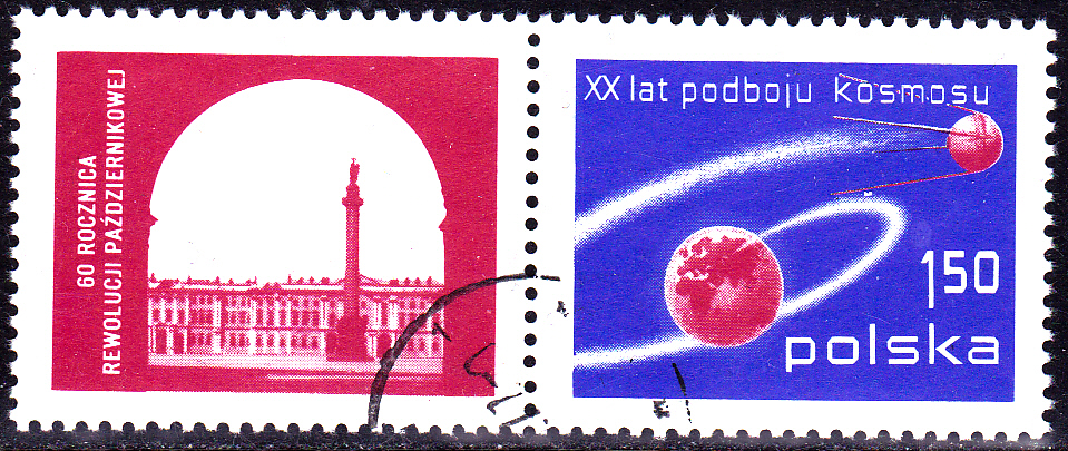 In Polen erschien zum 60. Jahrestag der Oktoberrevolution und 20 Jahre Eroberung des Kosmos eine Marke (MiNr 2524) mit der Abbildung "Sputnik 1 umkreist die Erde" erschienen. Hier zeige ich eine Marke mit Zierfeld (MiNr 2524A Zf).