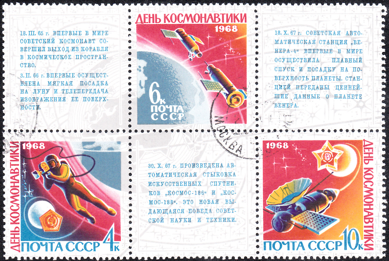 In einer Serie zum "Tag der Kosmonauten" 1968 erschien in der Sowjetunion auch eine Marke (MiNr 3480), die den Kosmonauten Leonow bei seinem "Ausflug" in den Weltraum zeigt.