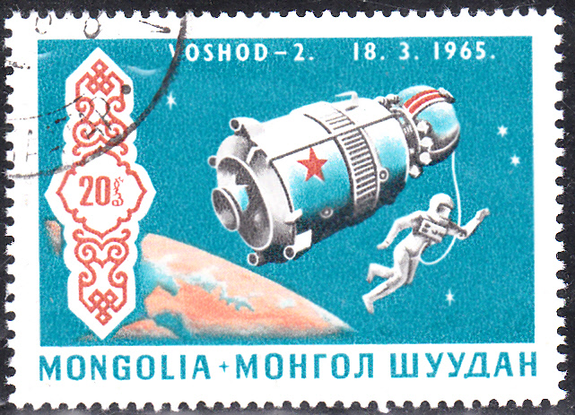 In einer Serie "Geschichte der Raumfahrt" erschien in der Mongolei auch eine Marke (MiNr 573) mit Woschod 2 und A. Leonow im Weltraum.