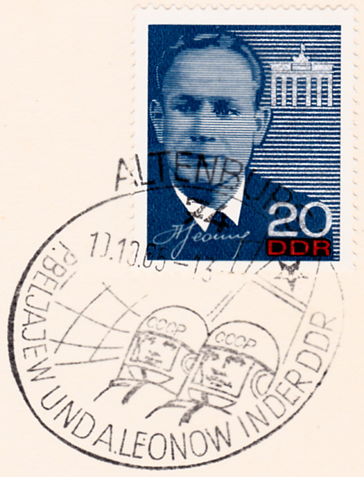Sonderstempel aus Altenburg vom 10.10.1965 zum Besuch der beiden Kosmonauten P. Beljajew und A. Leonow in der DDR. Im Stempel werden die Kosmonauten gezeigt.