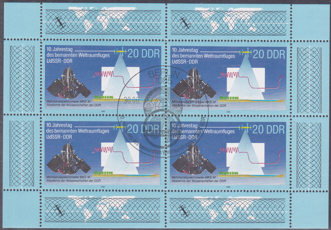 Ich zeige auch den Kleinbogen mit der Marke zu 20Pf (MiNr 3191) zum 10. Jahrestag des gemeinsamen Weltraumfluges UdSSR-DDR mit dem Ersttagsonderstempel Berlin.