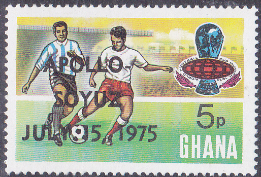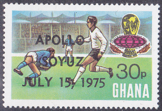 Zum Amerikanisch-sowjetisches Raumfahrtunternehmen Apollo-Sojus ist in Ghana die Serie zur Fußball-Weltmeisterschaft 1994 (MiNr 564-571) mit einem Buchdruck-Aufdruck "APOLLO- / SOYUZ / JULY 15, 1975" erschienen.
