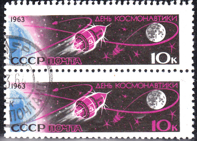 Auf diesen beiden Marken aus der Sowjetunion zum "Tag der Kosmonauten" ist ein Raumschiff vom Typ "Wostok" zu sehen. Die beiden Marken unterscheiden sich in der Farbe der Wertziffer: weiß (MiNr 2748) und rosa (MiNr 2751). Diese Marken wurden mit vier weiteren Marken zusammenhängend als Sechserblick gedruckt.