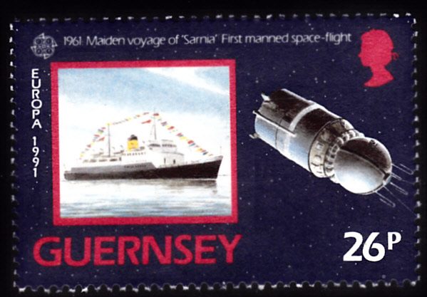 Auf einer Europamarke 1991 aus Großbritannien-Guernsey (MiNr 520) wird auch Wostok 1 gezeigt.