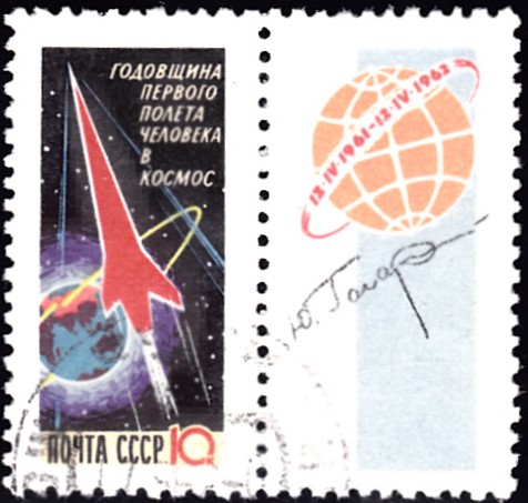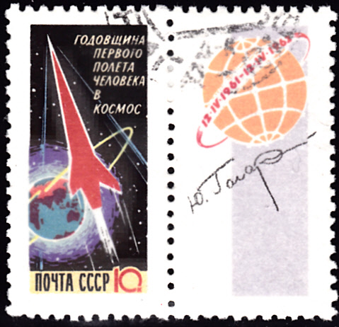 Auf einer Marke aus der Serie "Tag der Kosmonauten" 1964 (MiNr 2897 A) werden Jurij Gagarin das Raumschiff Wostok 1 und die Erde gezeigt.