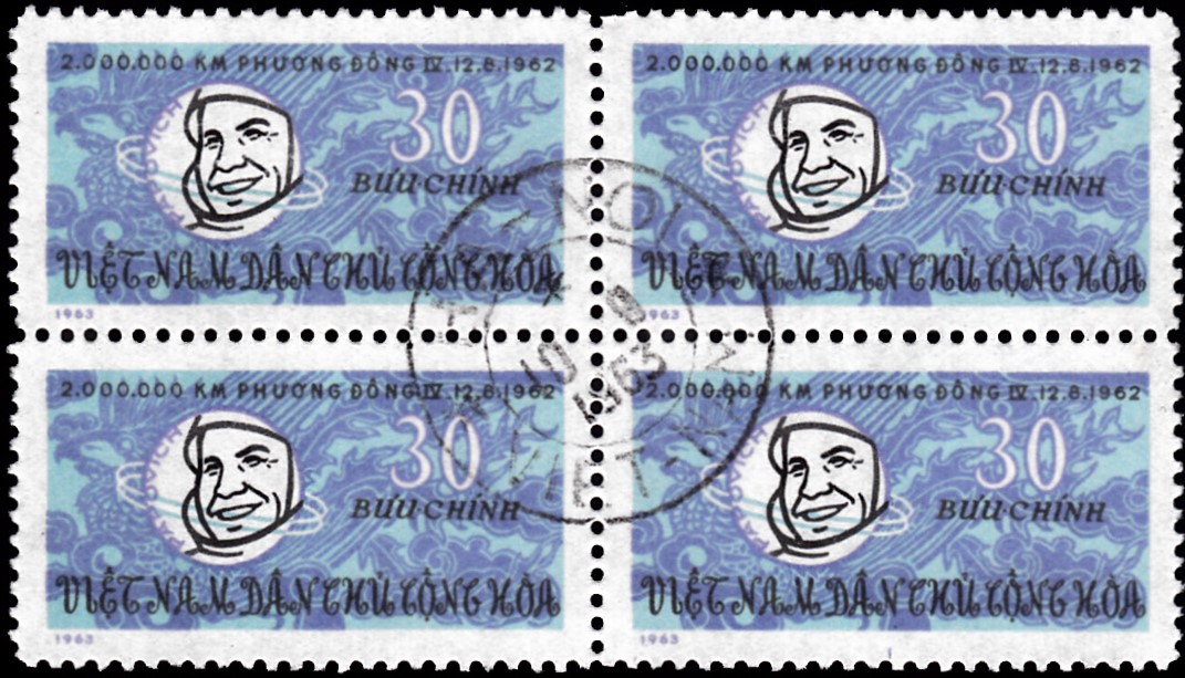 Die hier schon vorher gezeigte Marke aus Rumänien (MiNr 2242) mit dem Kosmonauten A. G. Nikolajew wurde auch als geschnittene Marke (MiNr 2252) in etwas anderen Farben verausgabt.