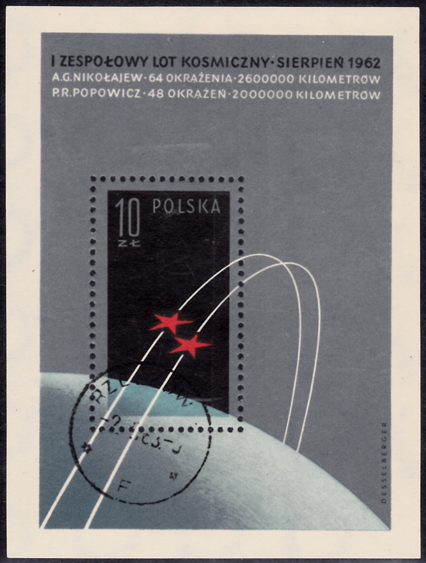 Ergänzend zu den beiden bereits gezeigten Polen folgt nun noch der Block aus Polen (MiNr Block 28 mit Marke MiNr 1352) mit der Abbildung von zwei Sternen als Symbol für den Gruppenflug.