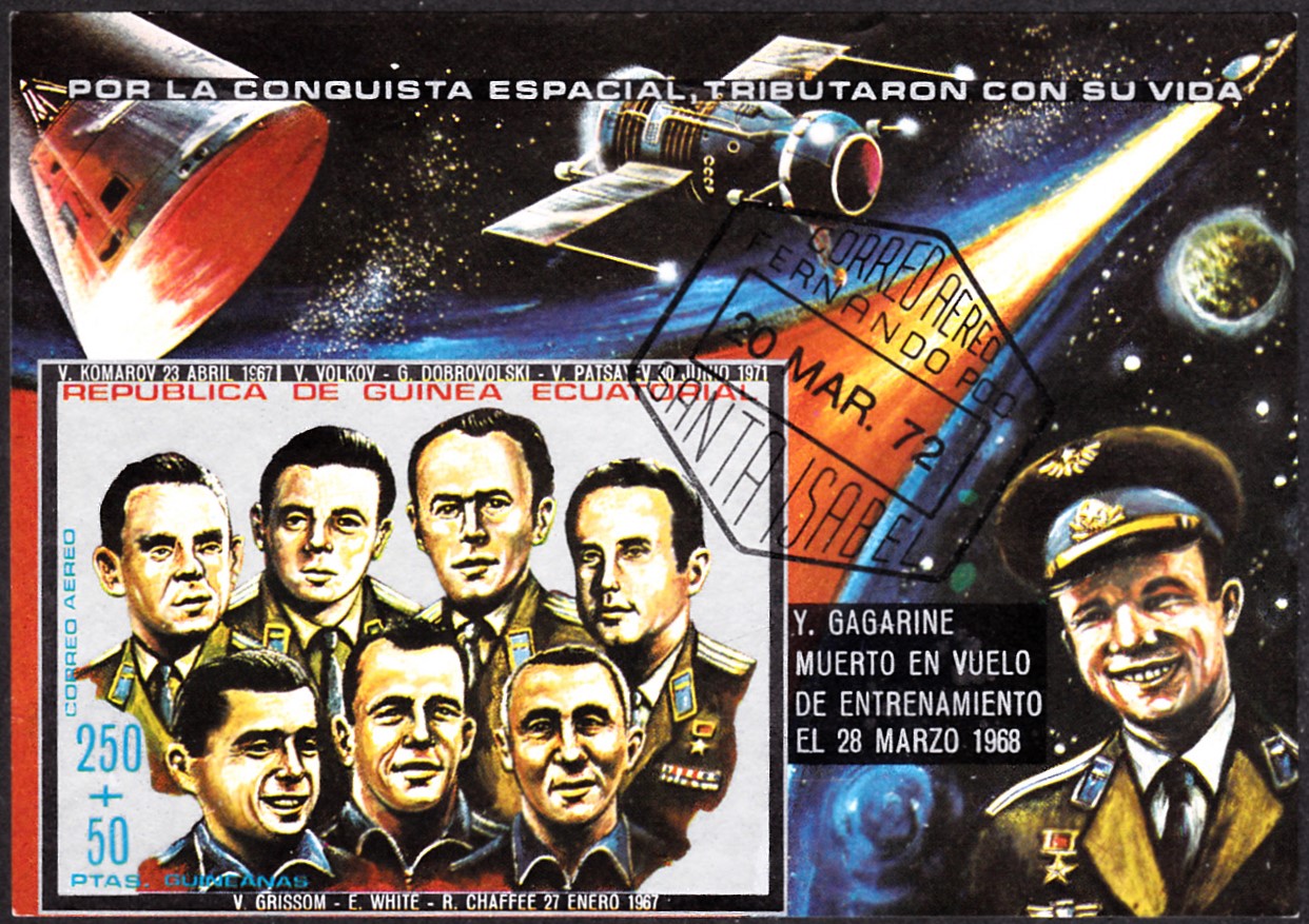 Auf dem Blockrand dieses Blockes aus Äquatorial-Guinea (MiNr Block 52 mit Marke MiNr A 197) ist Jury Gagarin auf dem Block zu sehen.