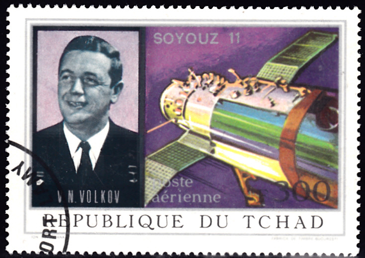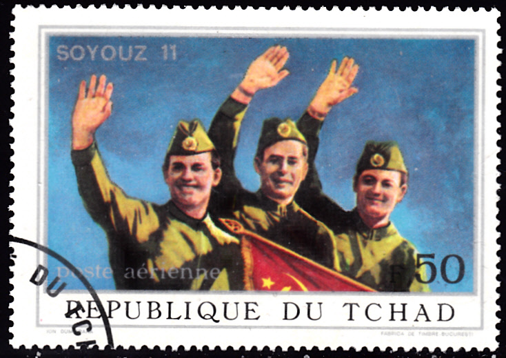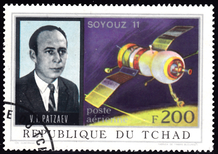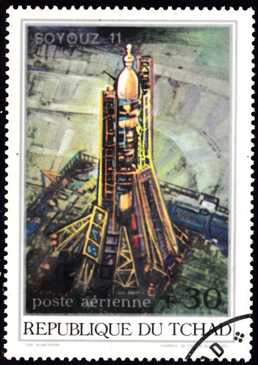 Zum Start von Sojus 11 ist im Tschad in einer Serie "Sojus 11" diese Marke (MiNr 450 A) erschienen. Sie zeigt die Raketenstartrampe für Sojus 11.