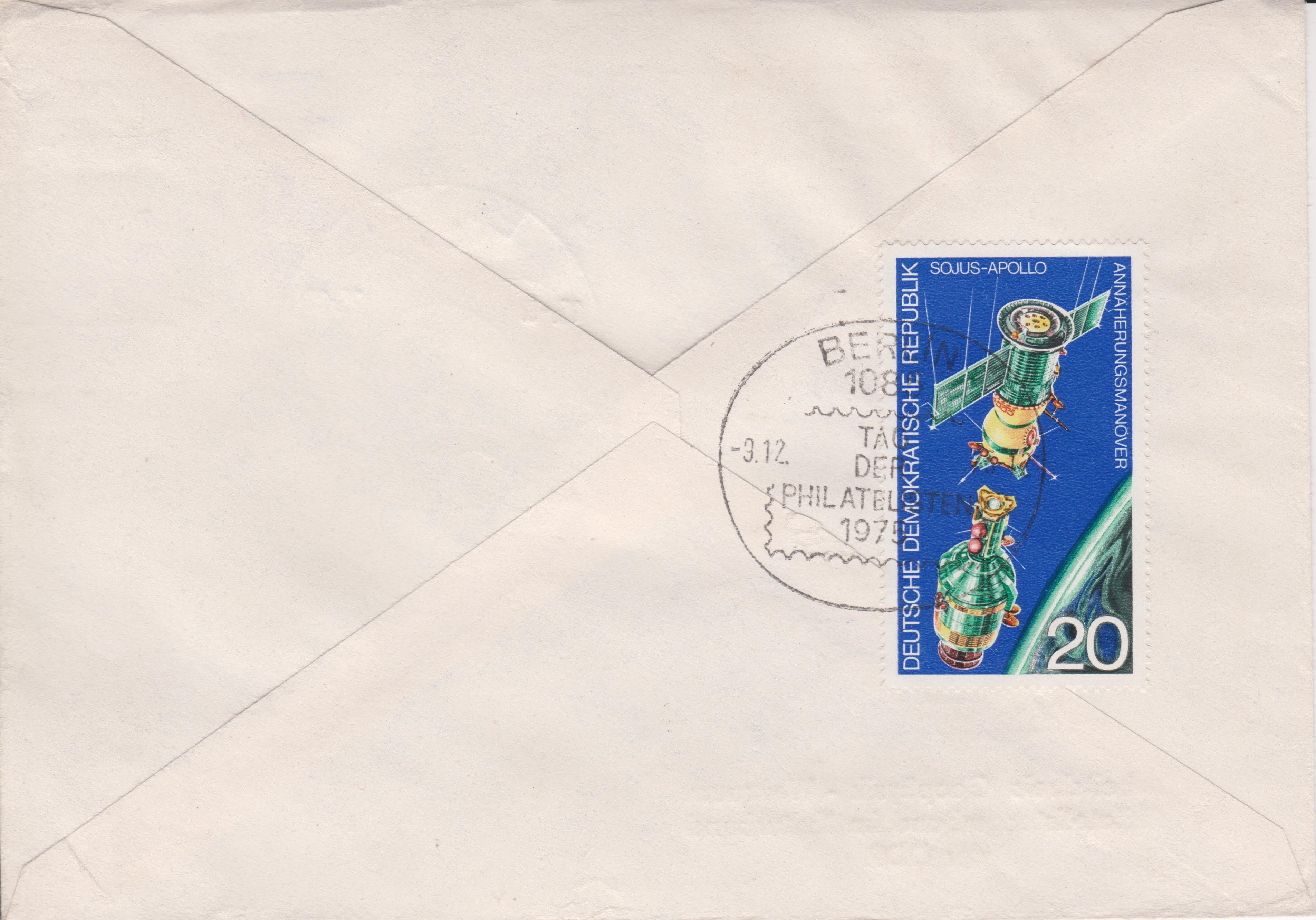 Dann wurde rückseitig eine DDR MiNr. 2084 verklebt, die das Annäherungsmanöver SOJUS 19/APOLLO 18 zeigt: