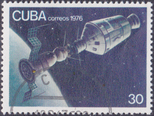 Aus Kuba kommt diese Marke (MiNr 2130) mit einer Abbildung zum erfolgreichen Kopplungsmanövers Apollo-Sojus.