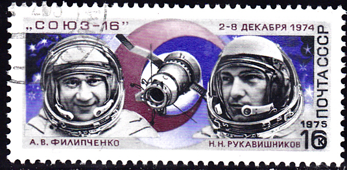 Diese Marke der Sowjetunion (MiNr 4344) zeigt die Kosmonauten Anatolij Filiptschenko (1928-2022) und Nikolaj Rukawischnikow (1932-2002).