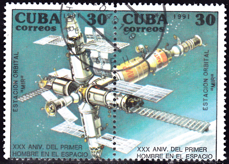 Auf einer Marke aus Kuba (MiNr 3174) sehen wir den Orbitalkomplex „Mir – Kuant". Zu diesem Zeitpunkt war die Raumstation im Anfangsstadium und noch nicht ganz ausgebaut