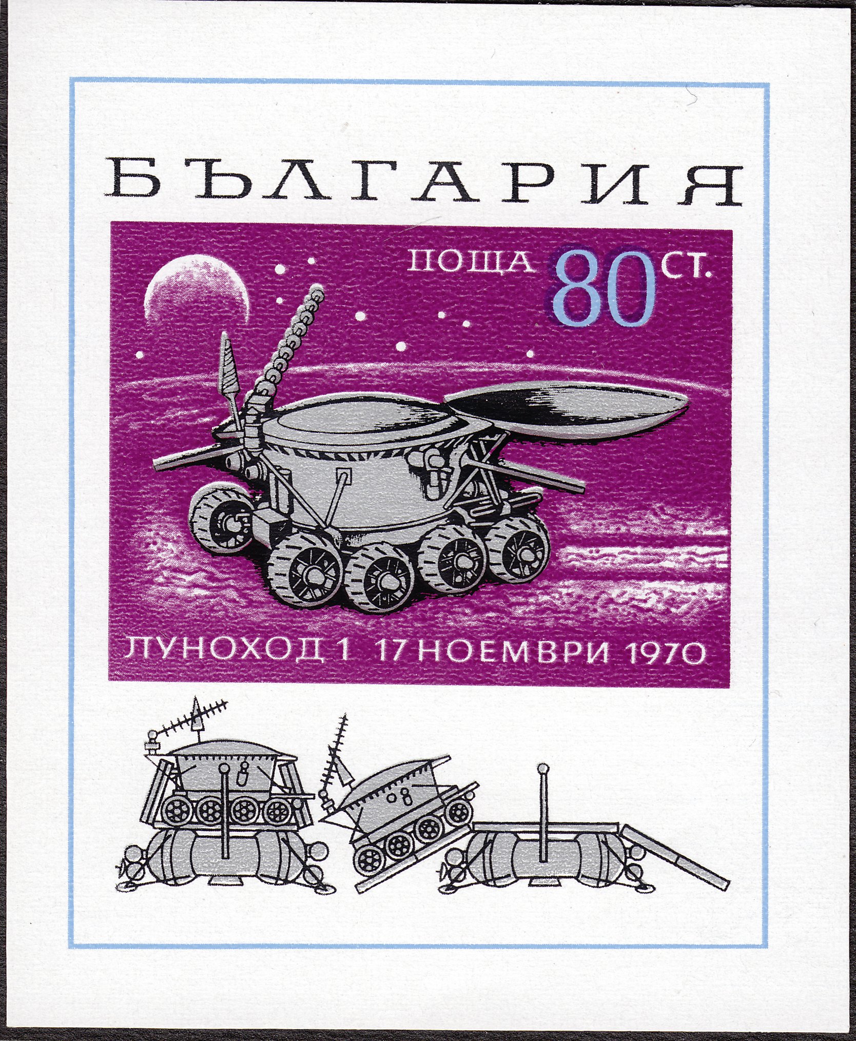 Eine vierte Marke (MiNr 3860) bildet das Mondmobil Lunochod 1 ab. Auch hier ist die Blockmarke (MiNr 3864) im kleineren Format gezeigt.