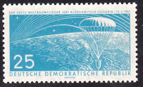 Bereits am 18.4.1961, also sechs Tage nach dem Start, erschien in der DDR eine Marke zu 10Pf (MiNr 822), die die Endstufe der Trägerrakete des Raumschiffs "Wostok I1" und einen Teil der Erdkugel zeigen soll.