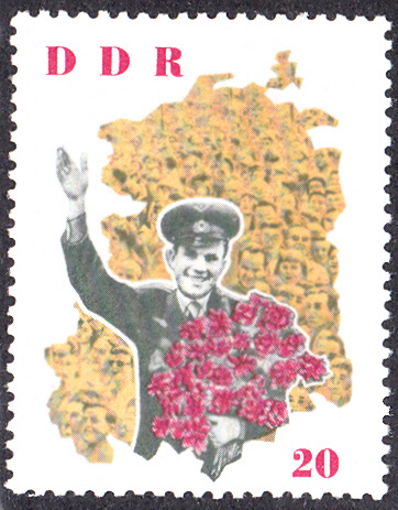 In einer Serie zum Besuch sowjetischer Kosmonauten in der DDR ist diese Marke (MiNr 995) mit Juri Gagarin mit einem Blumenstrauß vor einer Menschenmenge erschienen.