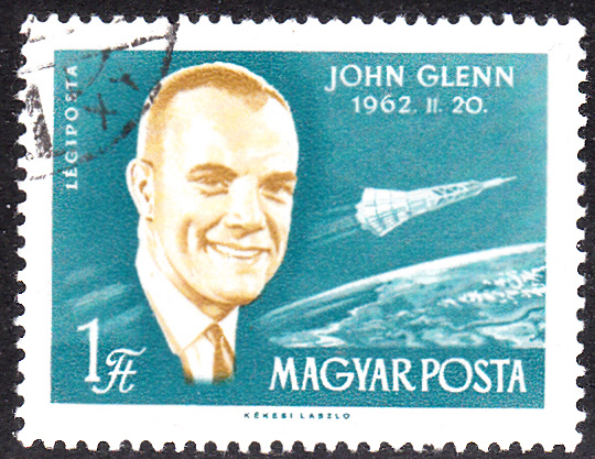 Auf dieser Marke aus Ungarn (MiNr 1875 A) sehen wir ein Porträt von John Glenn und die Mercury "Friendship 7" beim Flug um die Erde.