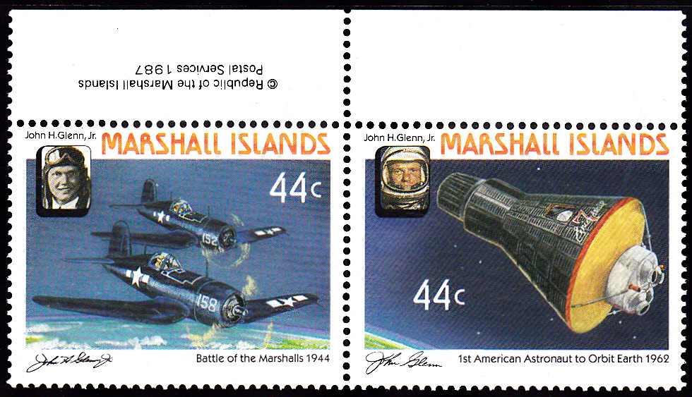In einer Serie "Geschichte der Luftfahrt" erschien auf den Marshall-Inseln diese Marke (MiNr 118) mit John Glenn und der Mercury Kapsel.