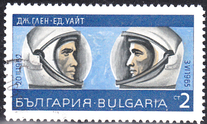 Es folgt eine Marke aus Bulgarien (MiNr 1759), die die Astronauten John Glenn (Mercury-Atlas 6 (MA-6), 20.2.1962) und E. White (Gemini 4 (GT-4), 3.6.1965) zeigt.